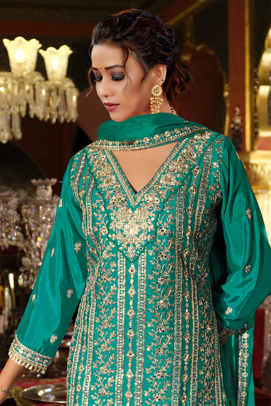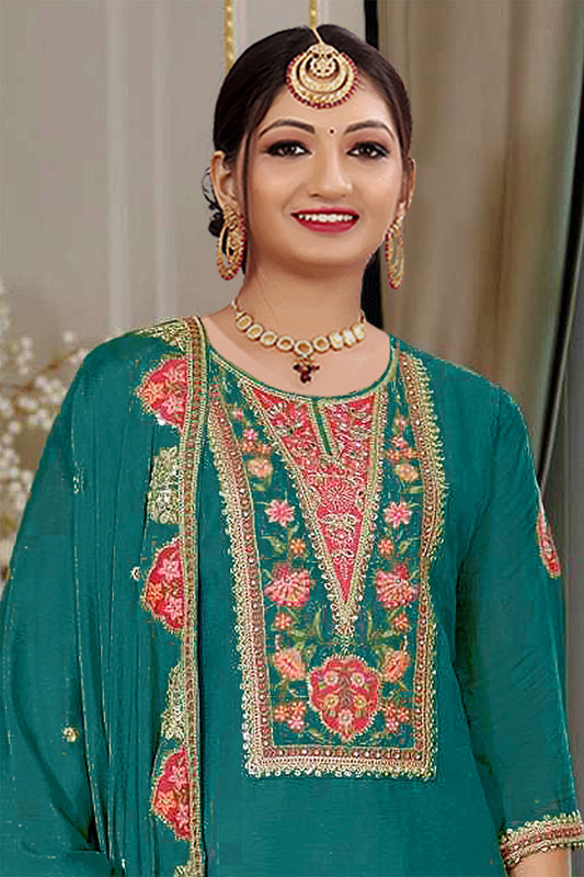 RUDRAPRAYAG Women's Chinon Fabric With Embroidery Sequence Work With Semi Stitched Top And Full Stitched Palazzo With Dupatta