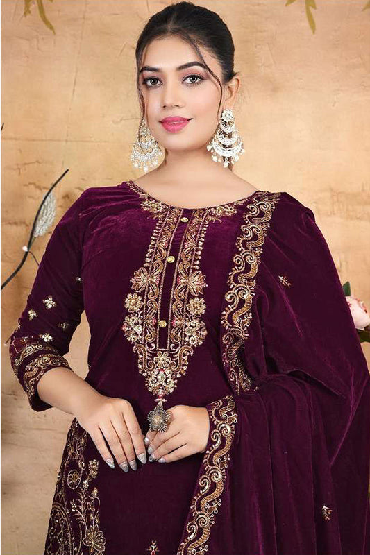 RUDRAPRAYAG Women's Velvet Fabric Semi Stitched Embroidery With Zarkan Work Straight Pant Anarkali Salwar Suit With Sequence Work Dupatta