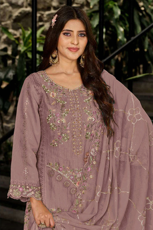 RUDRAPRAYAG Women's Chinon Fabric With Embroidery Sequence Work With Semi Stitched Top And Full Stitched Palazzo With Dupatta