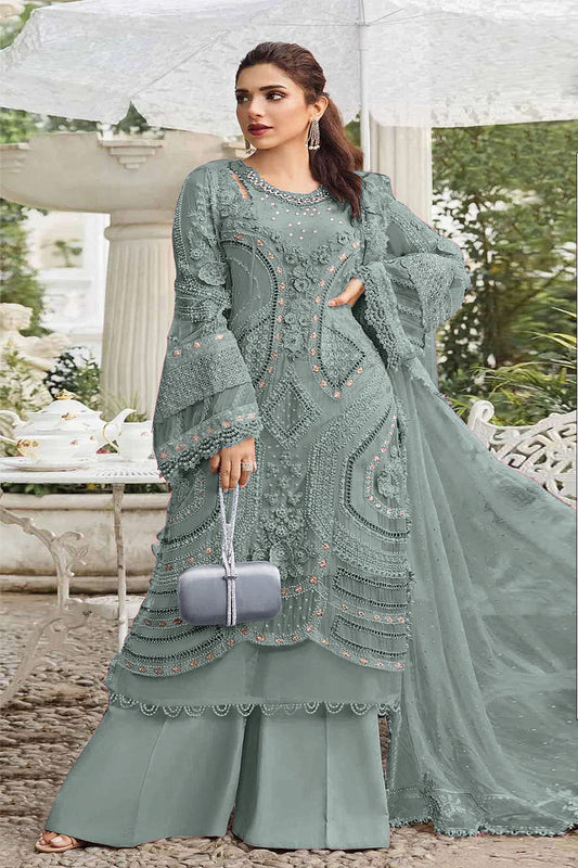 RUDRAPRAYAG Faux Georgette Fabric With Heavy Embroidered Sequence With Moti Hand Work Semi Stitched Round Neck Salwar Suit Palazzo With Dupatta For Women