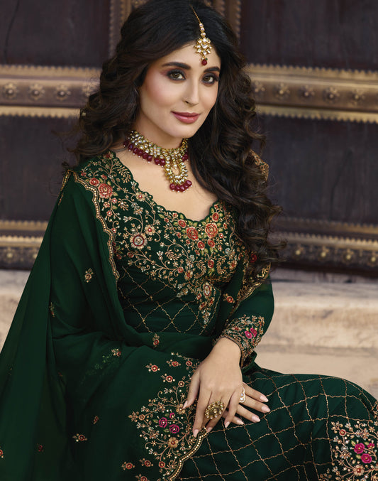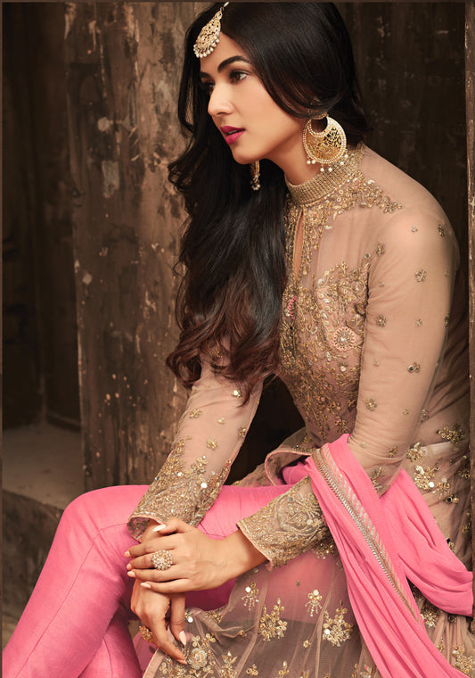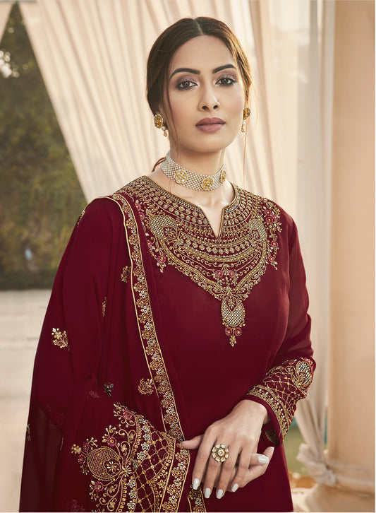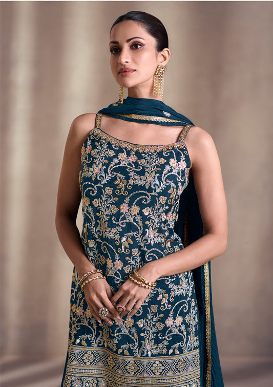 Georgette and Santoon Embroidred Straight Anarkali Sharara Suit For Women With Dupatta