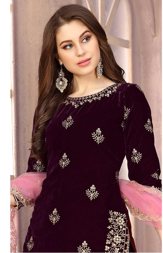 Women's Embroidery And Stone Work Velvet Patiala Suit With Net Dupatta