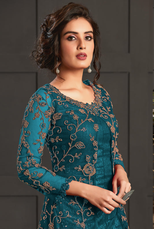 Anarkali Net and Satin Embroidered Straight Palazzo Suits For Women