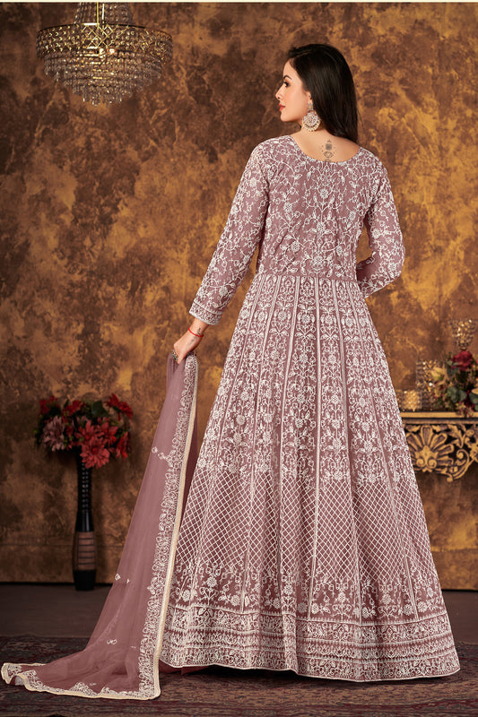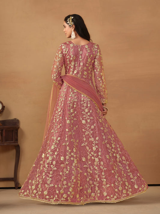 Pink Net And Satin Floral Embroidered Anarakli Gown With Dupatta